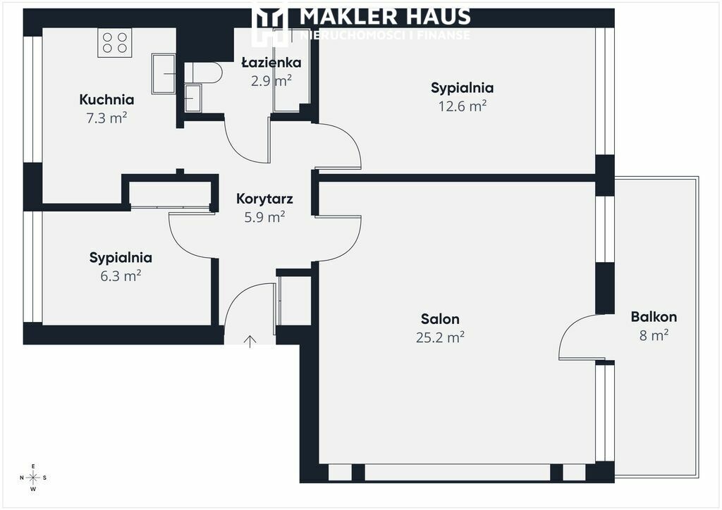 2 sypialnie (12,60 + 6,30 m2)duży salon (25,20 m2) z przestronnym