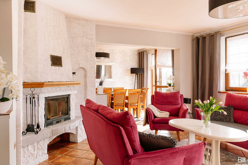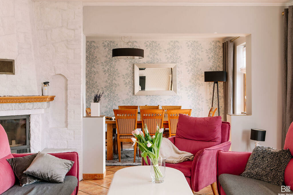 - Wnętrze zaprojektowane w bardzo funkcjonalny sposób, z wyraźnym podziałem na dwie strefy - dzienną i prywatną. Część dzienna obejmuje m.in. przestronny salon z kominkiem, jadalnię, kuchnię oraz WC. W strefie prywatnej znajdują się 3 sypialnie oraz łazienka z wanną. Obie części oddzielone są korytarzem, co zapewnia komfort akustyczny oraz wygodę codziennego użytkowania.