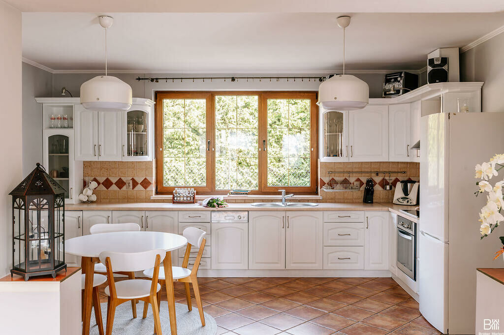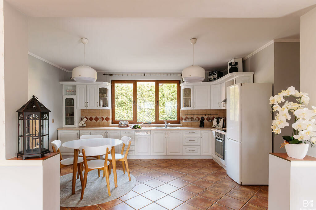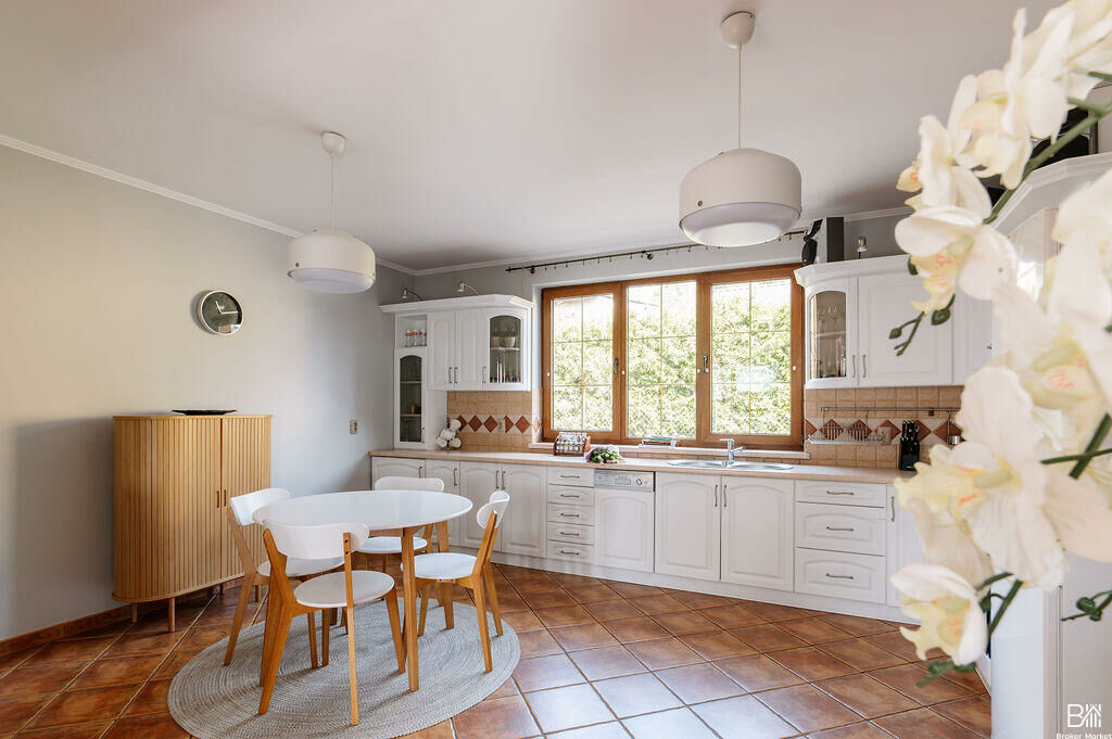 - Dom jest w pełni podpiwniczony - w piwnicy znajduje się m.in. dodatkowa robocza kuchnia z pralnią, która doskonale sprawdza się do przechowywania zapasów/sprzętów kuchennych, przygotowywania przetworów, a także stanowi praktyczną przestrzeń podczas spotkań na świeżym powietrzu, np. podczas grillowania. Dodatkowo na tej kondygnacji znajduje się łazienka z prysznicem oraz garaż.