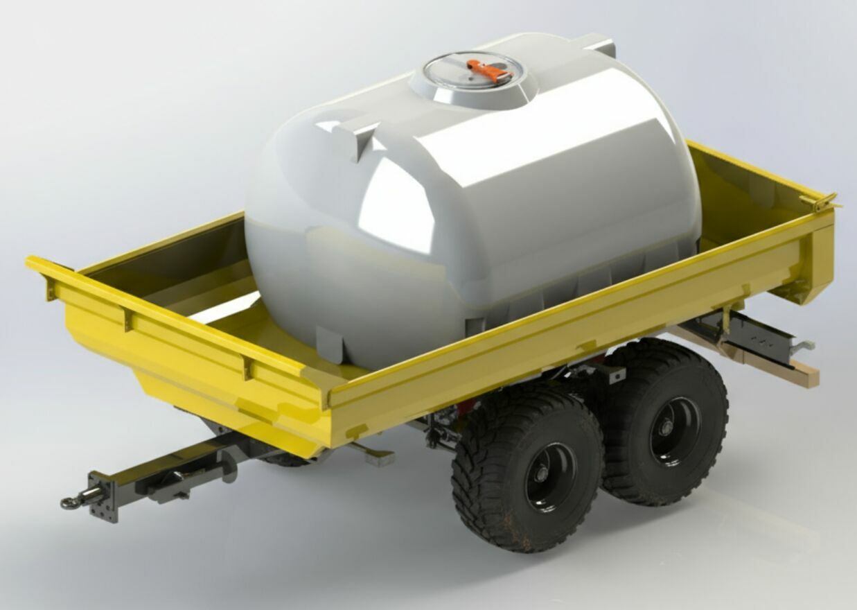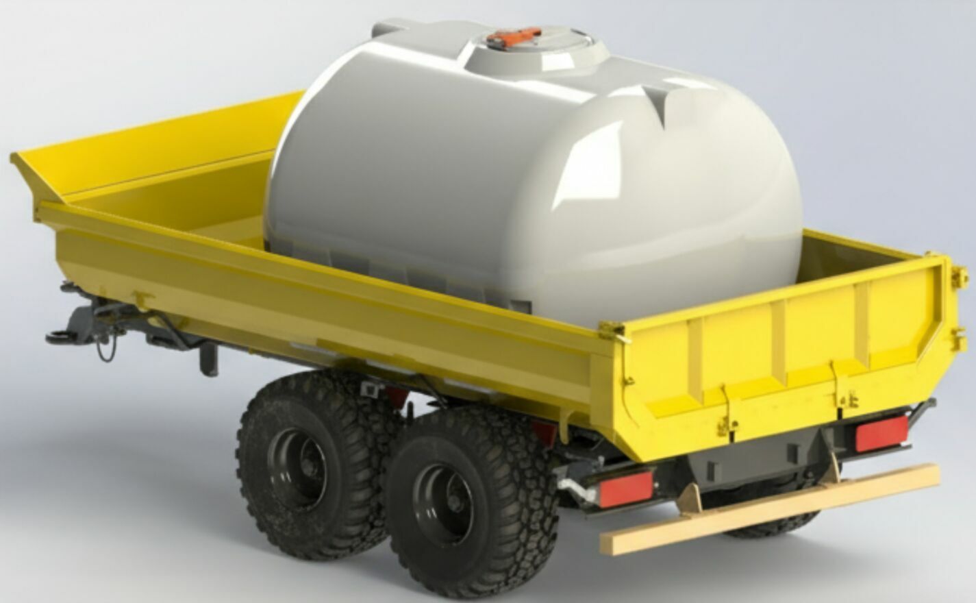Przyczepa wykonana z Hardox 500 Tuf, o ładowności 12 t, z możliwością montażu zbiorników lub innego wyposażenia.